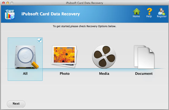 Step1: Download, install and run the Card Data Recovery for Mac on your computer. Select the recovery option you want to recover from the memory card on the Mac. Click "Next".
