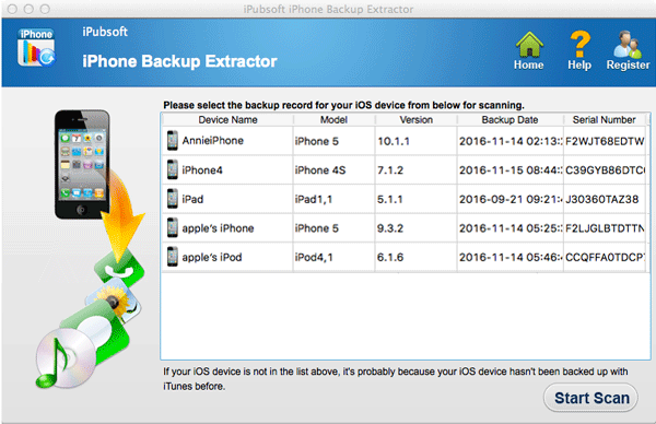 Download the Mac iPhone Backup Extractor for free, install and launch it on your Mac machine. Run it and the smart software will scan all your backup files on your local disk automatically. Just choose the one for your iPhone and click the button of "Start Scan" on the lower right of the main interface to scan the iPhone backup files.