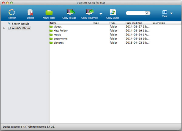 Just like you did as usual, connect your iPhone to computer with its USB cable. Launch iPubsoft Adisk, and it will automatically recognize your device. If not, click "Refresh" button on the top. Once the device is scanned successfully, its capacity and free space information will be displayed at the bottom line of the program’s screen.