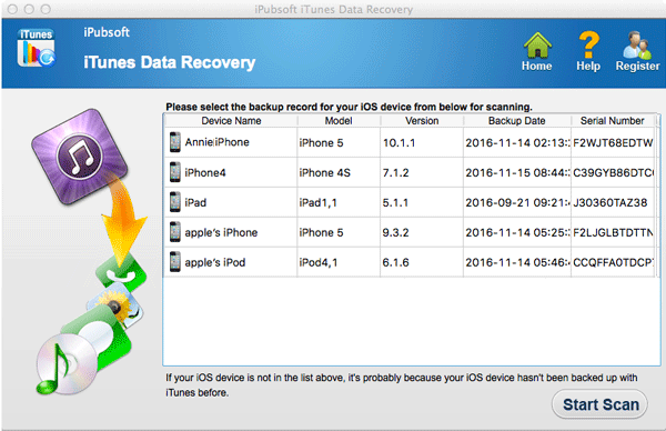 This iTunes Data Recovery for Mac works well on kinds of files recovery for all models of Apple iPad, iPhone or iPod touch from the previously iTunes backup generated on a Mac.